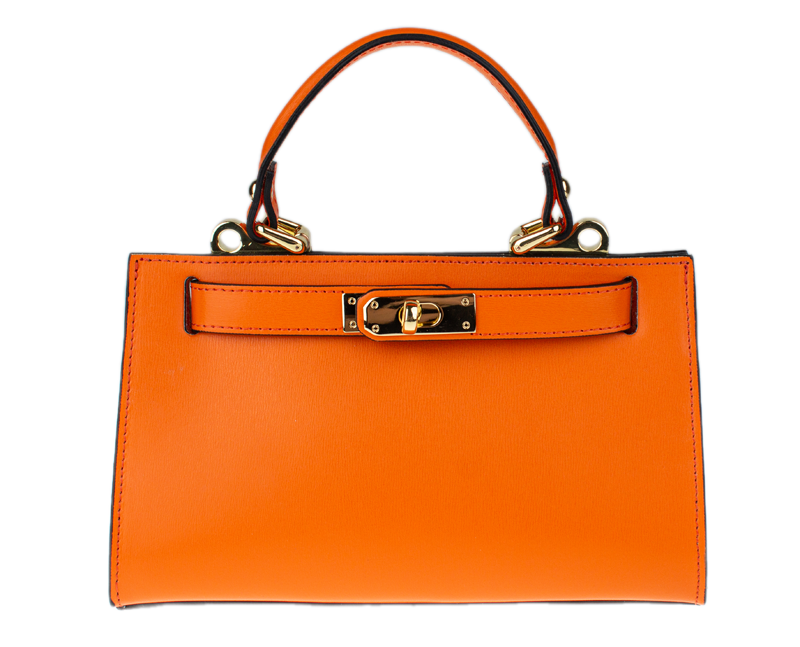 Malá kabelka z pevné kůže v oranžové barvě. Kabelku lze nosit v ruce nebo přes rameno. Max. délka přídavného pásku je 115 cm. Kabelka je vybavena důmyslným a elegantním zapínáním. Uvnitř kabelky nalezneme kapsu na mobil či klíče.