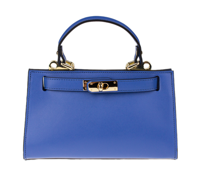 Malá kabelka z pevné kůže v modré barvě. Kabelku lze nosit v ruce nebo přes rameno. Max. délka přídavného pásku je 115 cm. Kabelka je vybavena důmyslným  a elegantním zapínáním. Uvnitř kabelky nalezneme kapsu na mobil či klíče.