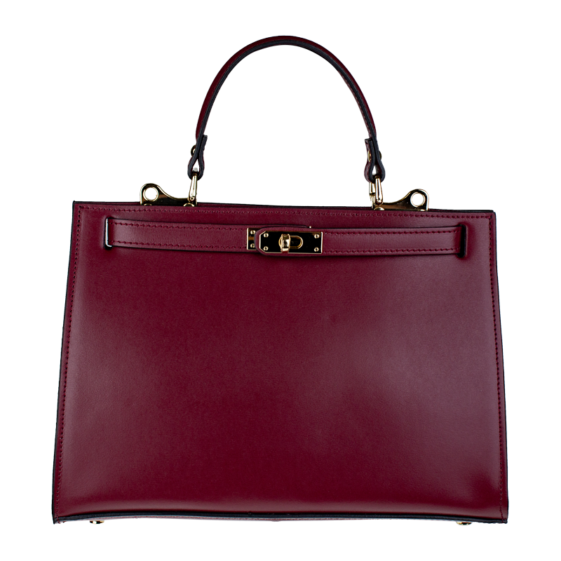 Krásná kabelka z pevné kůže v bordo barvě. Kabelku lze nosit v ruce nebo přes rameno. Max. délka přídavného pásku je 115 cm. Kabelka je vybavena důmyslným a elegantním zapínáním. Uvnitř kabelky nalezneme kapsu na mobil či klíče.
