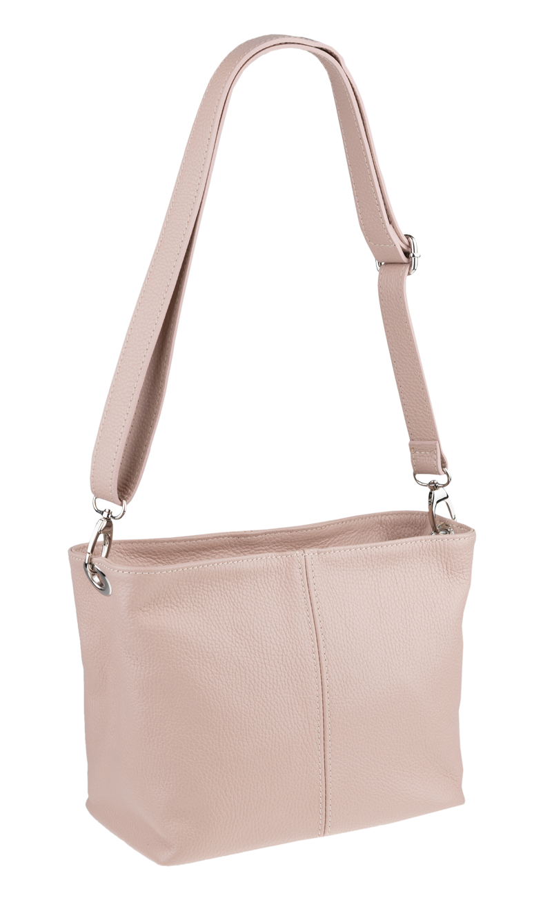 Růžová kabelka nositelná přes rameno či cross-body (křížem). Tato kožená kabelka je uzavíratelná na zip. Uvnitř kabelky najdeme přepážku uprostřed, která zároveň slouží jako kapsa na zip, a na boční stěně pak kapsu na zip. Hloubka jejího dna je 13 cm. Kabelka má navíc nastavitelný popruh s maximální délkou cca 120 cm.