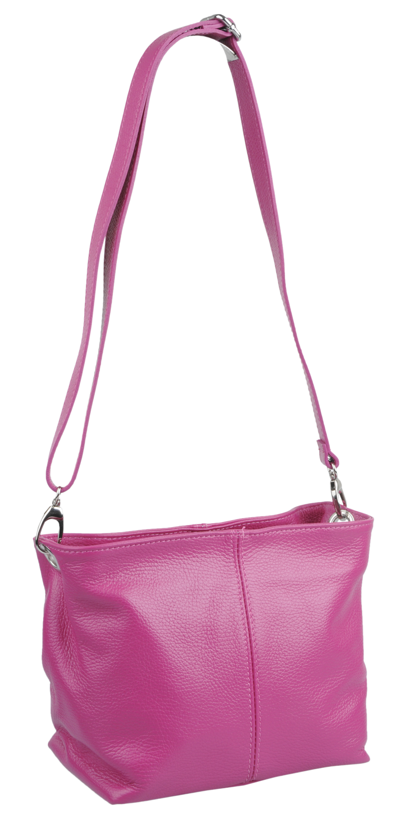 Růžová kabelka nositelná přes rameno či cross-body (křížem). Tato kožená kabelka je uzavíratelná na zip. Uvnitř kabelky najdeme přepážku uprostřed, která zároveň slouží jako kapsa na zip, a na boční stěně pak kapsu na zip. Hloubka jejího dna je 13 cm. Kabelka má navíc nastavitelný popruh s maximální délkou cca 120 cm.