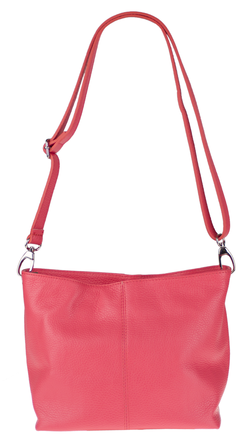 Růžová kabelka nositelná přes rameno či cross-body (křížem). Tato kožená kabelka je uzavíratelná na zip. Uvnitř kabelky najdeme přepážku uprostřed, která zároveň slouží jako kapsa na zip, a na boční stěně pak kapsu na zip. Hloubka jejího dna je 13 cm. Kabelka má navíc nastavitelný popruh s maximální délkou cca 120 cm.