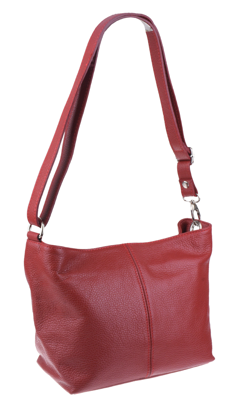 Červená kabelka nositelná přes rameno či cross-body (křížem). Tato kožená kabelka je uzavíratelná na zip. Uvnitř kabelky najdeme přepážku uprostřed, která zároveň slouží jako kapsa na zip, a na boční stěně pak kapsu na zip. Hloubka jejího dna je 13 cm. Kabelka má navíc nastavitelný popruh s maximální délkou cca 120 cm.