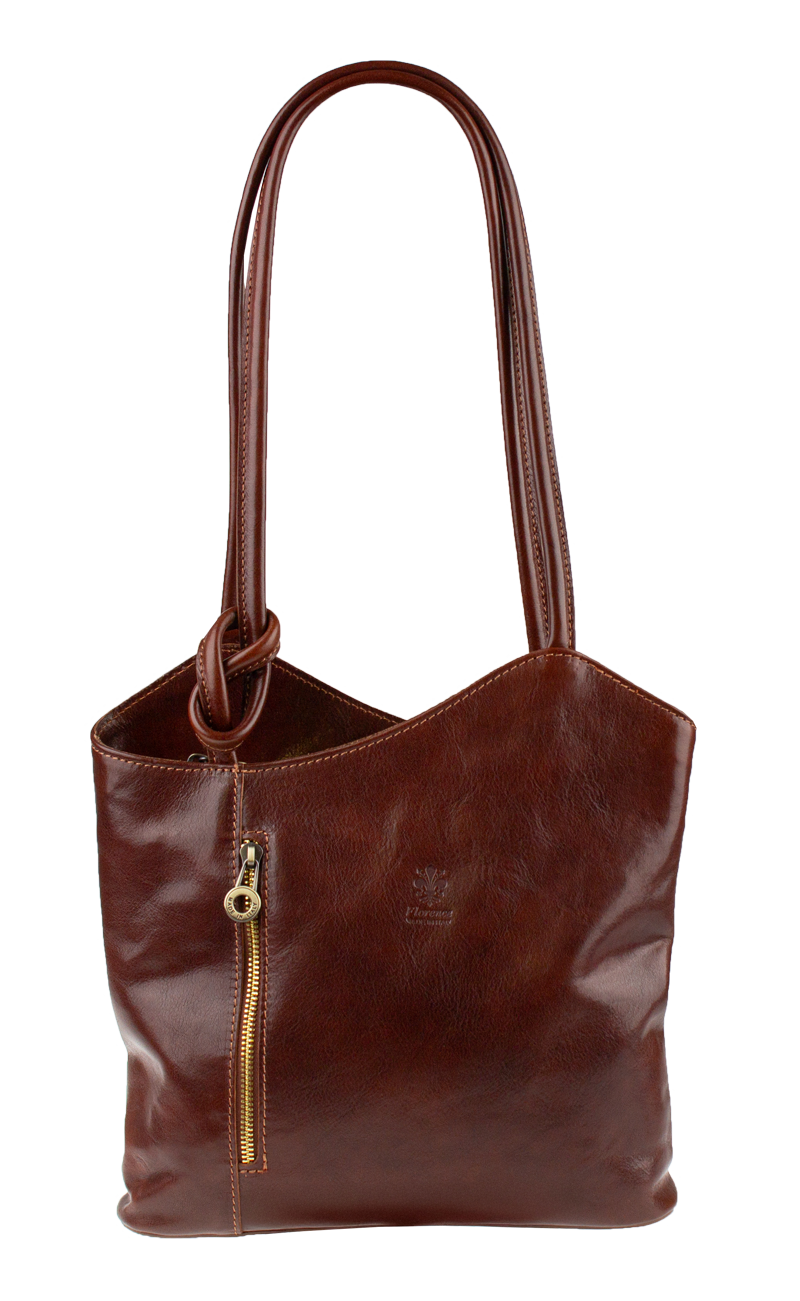 Krásná kožená kabelka v hnědé barvě. Výhodou této kabelky je, že ji lze nosit přes rameno, stejně tak jako batůžek. Je uzavíratelná na zip. Uvnitř má látkovou přepážku s kapsou, dále pak kapsičku na straně, obě také uzavíratelné na zip. Na druhé vnitřní straně jsou dvě otevřené kapsičky, například na telefon. Kabelka je vyrobena z hladké, pevné hovězí kůže. Hloubka dna je 8,5 cm.