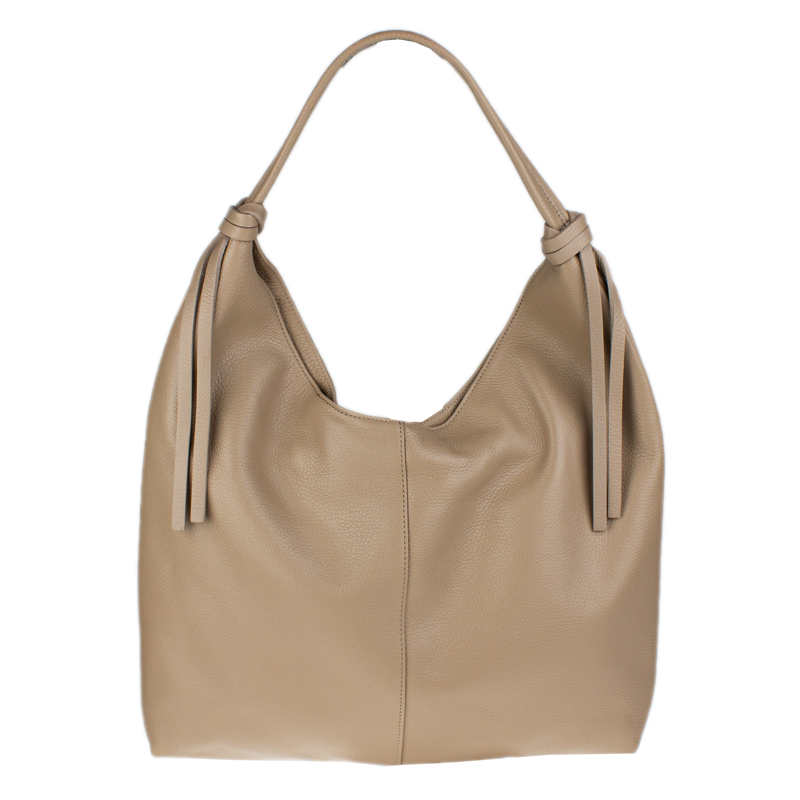 Tato stylová kabelka typu „shopping bag“ vás na první pohled zaujme svou krásnou tmavě-béžovou barvou a moderním, uvolněným střihem (tzv. hobo style). Je vyrobena z materiálu s jemnou zrnitou texturou, která jí dodává luxusní vzhled a je příjemná na dotek.
