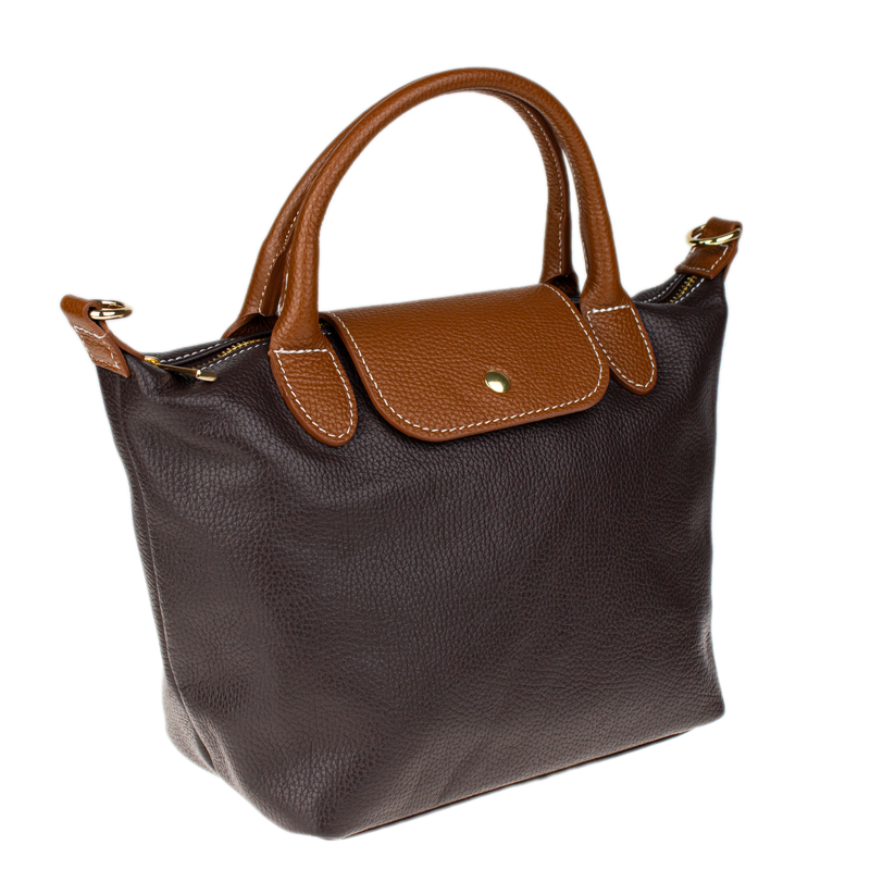 Kabelka je vyrobena z kvalitní pravé kůže s jemnou zrnitou strukturou, která je nejen příjemná na dotek, ale také odolná vůči poškrábání. Design sází na osvědčenou kombinaci tmavě hnědé barvy těla kabelky s kontrastními detaily v koňakovém odstínu (ucha, klopa, popruh). Celkový luxusní dojem doplňuje decentní zlaté kování a precizní světlé prošívání.