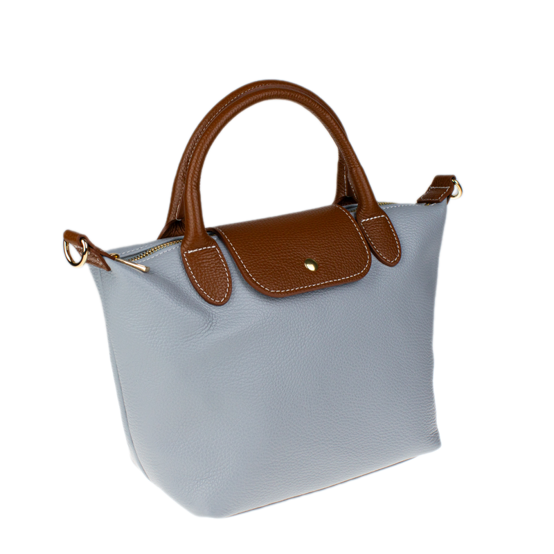 Kabelka je vyrobena z kvalitní pravé kůže s jemnou zrnitou strukturou, která je nejen příjemná na dotek, ale také odolná vůči poškrábání. Design sází na osvědčenou kombinaci světle-modré  barvy těla kabelky s kontrastními detaily v koňakovém odstínu (ucha, klopa, popruh). Celkový luxusní dojem doplňuje decentní zlaté kování a precizní světlé prošívání.