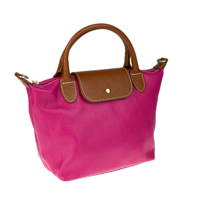 Kabelka je vyrobena z kvalitní pravé kůže s jemnou zrnitou strukturou, která je nejen příjemná na dotek, ale také odolná vůči poškrábání. Design sází na osvědčenou kombinaci fuxiové barvy těla kabelky s kontrastními detaily v koňakovém odstínu (ucha, klopa, popruh). Celkový luxusní dojem doplňuje decentní zlaté kování a precizní světlé prošívání.