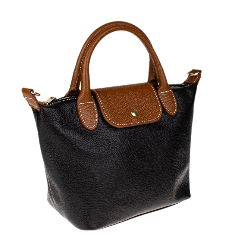 Kabelka je vyrobena z kvalitní pravé kůže s jemnou zrnitou strukturou, která je nejen příjemná na dotek, ale také odolná vůči poškrábání. Design sází na osvědčenou kombinaci černé barvy těla kabelky s kontrastními detaily v koňakovém odstínu (ucha, klopa, popruh). Celkový luxusní dojem doplňuje decentní zlaté kování a precizní světlé prošívání.