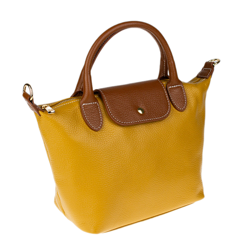 Kabelka je vyrobena z kvalitní pravé kůže s jemnou zrnitou strukturou, která je nejen příjemná na dotek, ale také odolná vůči poškrábání. Design sází na osvědčenou kombinaci žluté barvy těla kabelky s kontrastními detaily v koňakovém odstínu (ucha, klopa, popruh). Celkový luxusní dojem doplňuje decentní zlaté kování a precizní světlé prošívání.