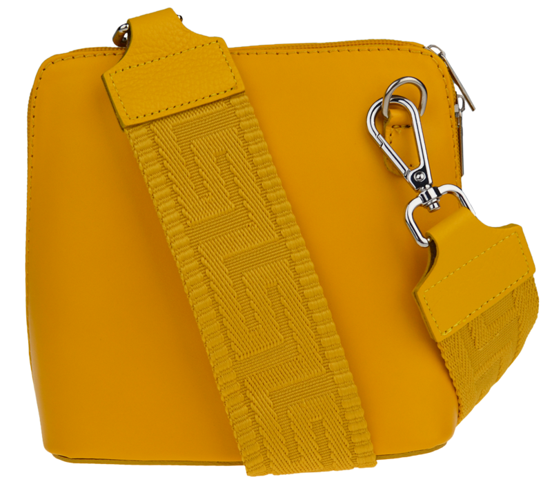 Elegantní, ale zároveň velmi praktická žlutá kabelka malých rozměrů vyrobena z pravé kůže. Díky tenkému pásku je nositelná přes rameno. Zip, kterým se uzavírá, vede po hraně kabelky až po spodní okraj na obou stranách, a proto je její vnitřek dobře dostupný. Na vnější zadní straně najdete na kabelce malou kapsu na zip a uvnitř dělí celý prostor na dvě části příčka, která současně slouží jako kapsa na zip. Hloubka jejího dna je 8 cm. Délka přídavného popruhu je cca 120 cm.