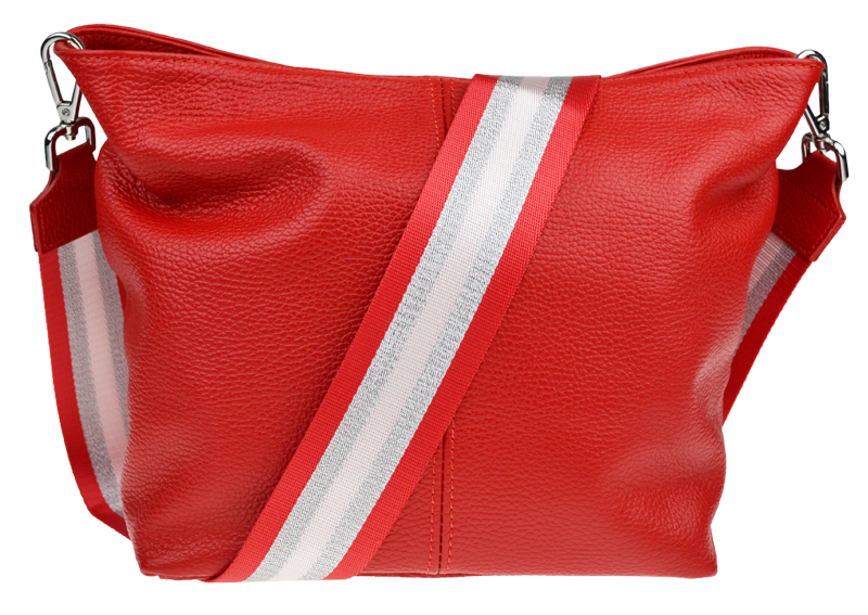 Červená kabelka nositelná přes rameno či cross-body (křížem). Tato kožená kabelka je uzavíratelná na zip. Uvnitř kabelky najdeme přepážku uprostřed, která zároveň slouží jako kapsa na zip, a na boční stěně pak kapsu na zip. Hloubka jejího dna je 13 cm.
