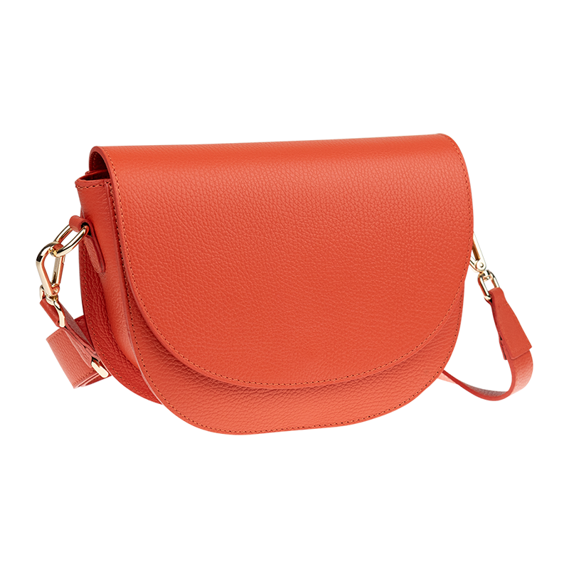 Oranžová kabelka nositelná přes rameno či cross-body (křížem). Tato kožená kabelka je uzavíratelná na patentku a uvnitř nalezneme přihrádku na zip. Kabelka má nastavitelný popruh s maximální délkou cca 140cm.